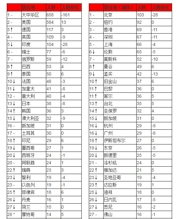 5. 中国和美国分别有658名和584名十亿美金富豪,位列一二。德国和英国取代印度,分别排在第三和第四位。北京连续第四年成为“世界十亿美金富豪之都”,以103人领先于纽约的92人。在前6名城市中,有4个中国城市,其中北京居首,其次是香港、深圳和上海。
