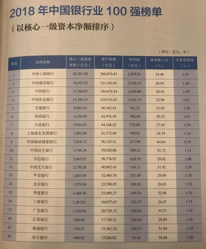 《蓝皮书》还以核心一级资本净额作为主要参考指标,发布了中国银行业100强榜单,其中6家国有大型银行、12家全国性股份行、63家城商行和19家农商行入围。