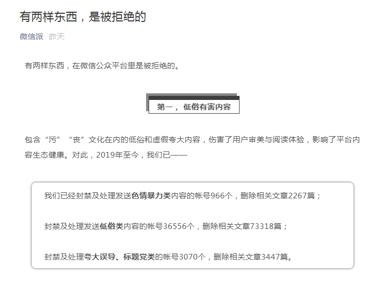 对此,2019年至今,微信已经封禁及处理发送色情暴力类内容的账号966个,删除相关文章2267篇;封禁及处理发送低俗类内容的账号36556个,删除相关文章73318篇;封禁及处理夸大误导、标题党类的账号3070个,删除相关文章3447篇。
