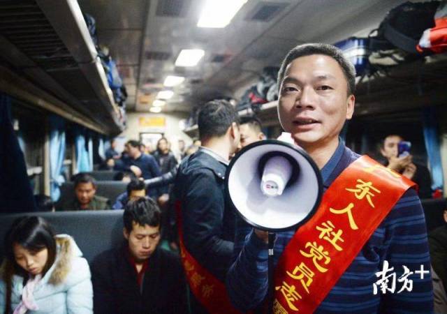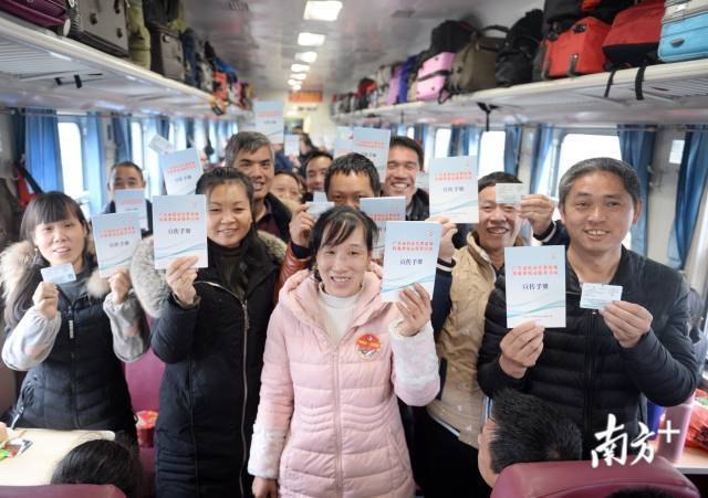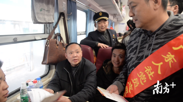 来自佛山市人力资源公共服务中心的袁志强刚给这节车厢派完资料。“车上像我这样的‘广东人社党员志愿服务者’有近10人,为务工人员面对面送岗位、送政策、送服务,我们这次带来了一万多个岗位信息,办个火车上的‘招聘会’,帮他们现场对接,欢迎来广东工作!”