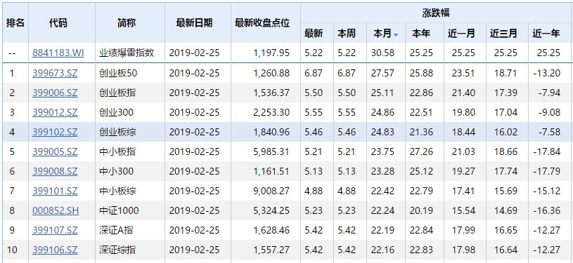 从横向比较来看,业绩爆雷指数的表现则更加惊人。2月以来,该指数大涨30.58%,碾压包括创业板50、创业板指、创业300、创业板综指、中小板指在内的一众指数。从近一个月、近三个月和近一年的表现来看,该指数同样表现突出。