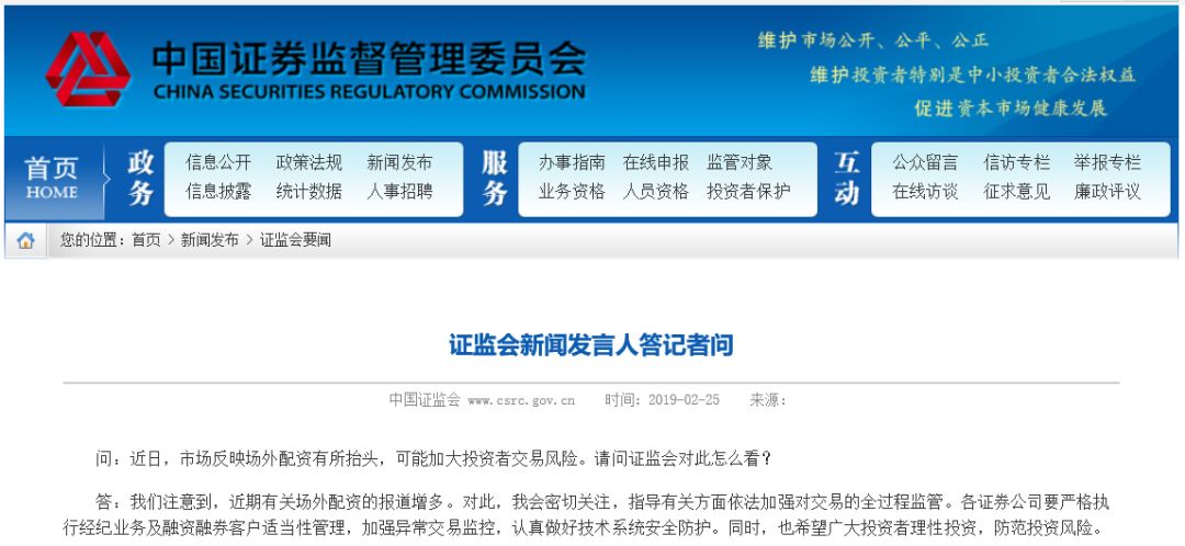 2月25日下午,证监会在回答记者关于“市场反映场外配资有所抬头,可能加大投资者交易风险”的提问时表示: