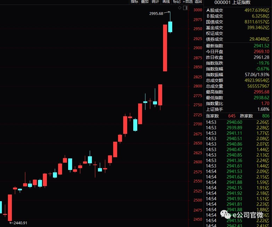 盘中上证指数一度涨超1%逼近3000点,创业板指一度涨近3%,临近收盘,短期获利盘大量涌现,各主要股指均出现大幅跳水,两市成交额再次突破万亿元,达10977亿元。