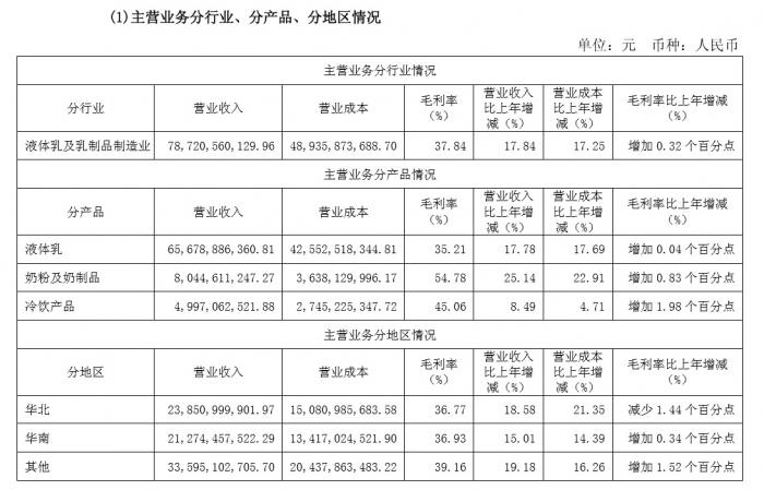 期内,伊利液体乳、奶粉及奶制品、冷饮产品分别实现营收656.79亿元、80.45亿元、49.97亿元,同比增长17.78%、25.14%和8.49%。