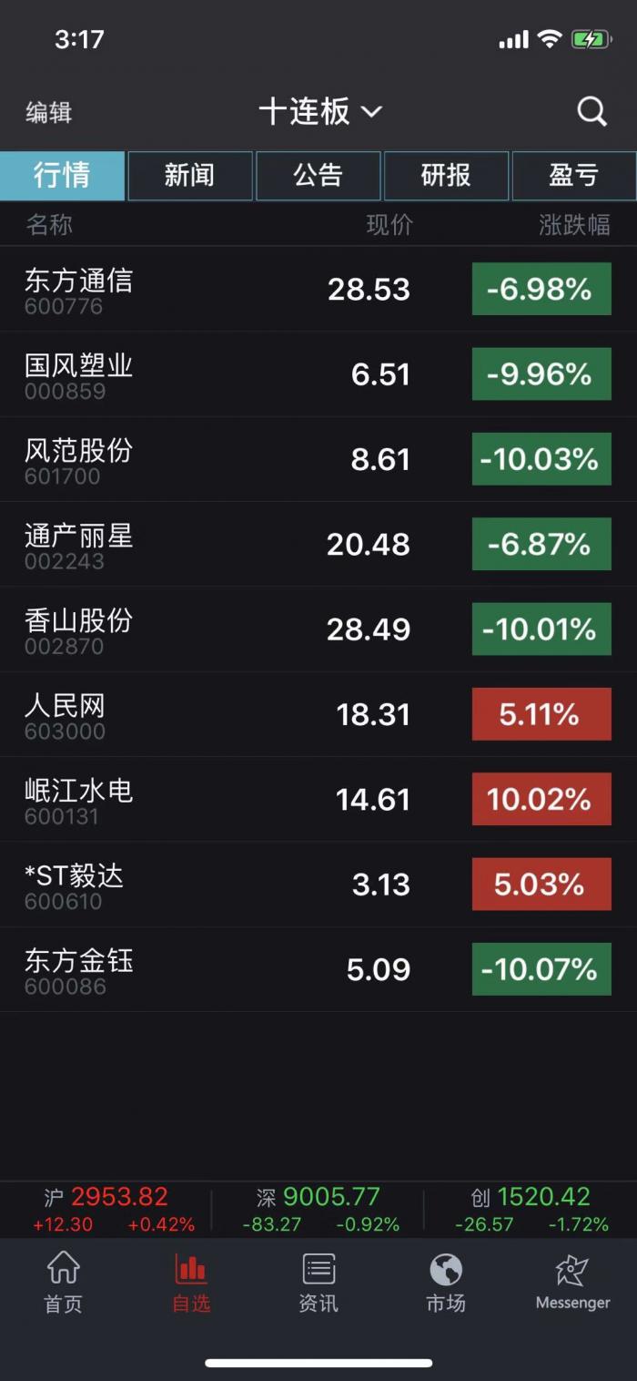 国风塑业、风范股份跌停,昨日涨停的香山股份加入跌停行列,东方金钰的下跌之势昨日已经显现,今天亦正式加入跌停之列。五连板的人民网涨幅收窄为5.11%。只有岷江水电、*ST毅达股价依旧坚挺。
