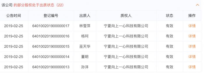 2月26日,老虎证券所在的宁夏向上融科科技发展有限公司共26个股东中,出现22个股东同时处于股权出质状态,且出质状态全部为有效,质权人均为宁夏向上一心科技有限公司,法定代表人为老虎证券创始人&CEO巫天华。