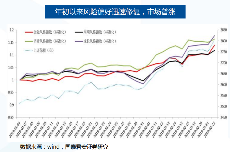 2019年初以来,A股上涨过程呈现出加速状态,中途没有发生显著回调。从行业风格指数来看,表现出从消费、金融、周期、成长顺次发力。