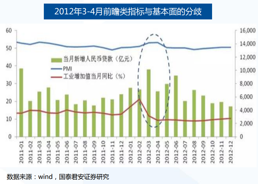 2012年初踏空行情是在经济下行节奏与政策发力节奏赛跑之中展开的,最终在经济数据下行中结束。2011年11月降准但市场情绪仍然偏于敏感,重庆啤酒复牌11个跌停触发市场小票急剧下跌。市场经历了大幅回调,海外欧央行提出LTRO缓解欧债危机,国内政策放松预期高涨,PMI、金融信贷数据表现较好,市场分歧焦点在于经济基本面改善是否持续下去。2012年一季度GDP较前值下降0.7%至8.1%,4月份工业增加值同比降至个位数9.4%。证监会推行金融改革使得市场风险偏好短期 重新回升,但最终并未改变五月后市场下跌趋势。