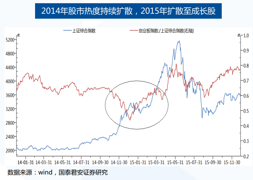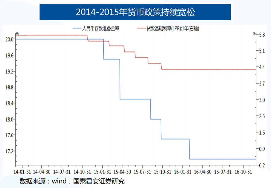 2014年受益于宽松货币政策以及持续政策利好,快速拉升后正式开启大牛市。2014年经济仍处于下行趋势中,但货币宽松 (降息降准)以及持续的利好政策下,股市快速拉升。2014年9月“大众创新、万众创业”提出,2014年11月正式开启新 一轮货币宽松周期,此后一系列新兴产业支撑性政策的推出,持续提升市场情绪。市场热度持续扩散,在2014年首先是权重股的拉升,并在2015年扩散至科技成长股,牛市一直持续至2015年年中,最终在清理场外配置,加强金融整顿后结束。