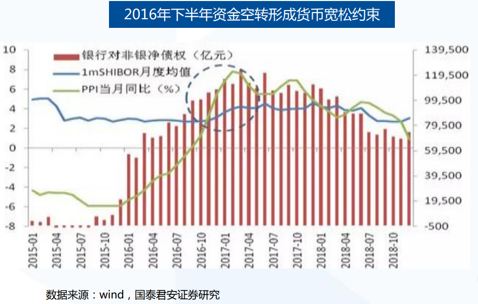2016年踏空行情是在经济层面的改善分歧中展开的,最终因政策强调防范金融风险而结束。在需求端若复苏情况下,去产 能影响已逐渐清晰显现,2016年7月工业企业库存周期开启,经济数据改善为为市场注意,但供给侧的变化尚未引起充分的重视,但是股市在周期品景气强势表现鼓舞下积极表现。但另一方面资金空转使得银行对非银机构净负债显著扩张,12月经济工作会议强调把防范金融风险放到更加重要的位置,金融股抛售带动市场下跌。