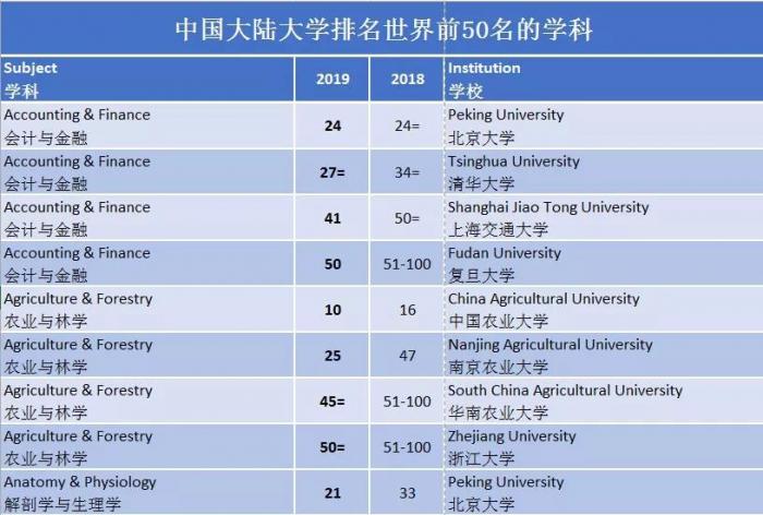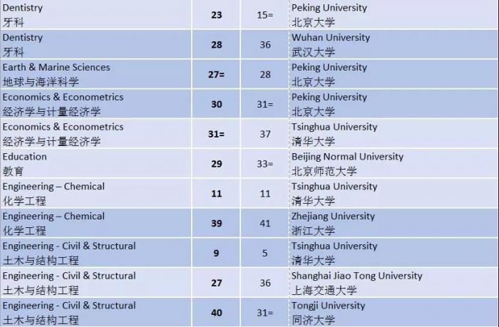 在本次排名中,多所中国高校的学科在全球范围内名列前茅。香港大学的牙医学科排名世界第4,清华大学的土木工程是中国大陆高校表现最好的学科,位列全球第9,清华大学的建筑、北京大学的现代语言、和中国农业大学的农学与林学学科,也都排名全球第10名。