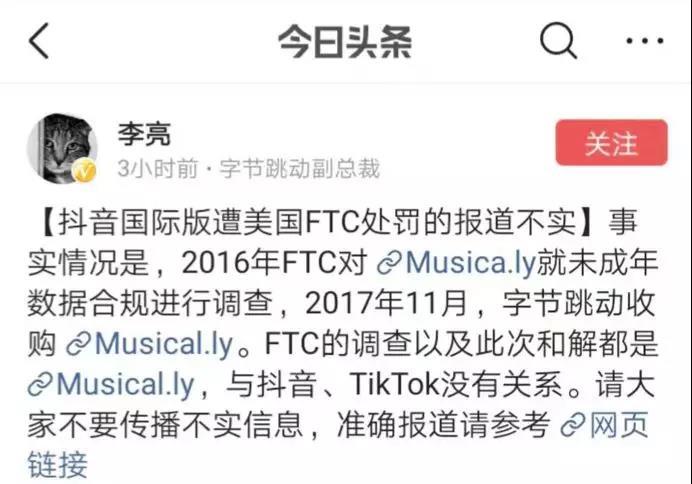 今天(2月28日)字节跳动总裁李亮在微头条上表示:事实情况是,2016年FTC对Musica.ly就未成年数据合规进行调查,2017年11月,字节跳动收购Musical.ly。FTC的调查以及此次和解都是Musical.ly,与抖音、TikTok没有关系。