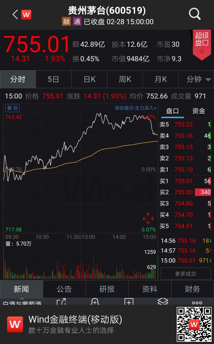 至2月28日,贵州茅台(600519. SH)报收755.01元,总市值重归9500亿元一线。这意味着,公司只需要上涨5.5%,总市值便将重归万亿,再上涨6.4%,便将超越前期高点803.5元。