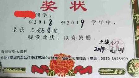 如:2019年1月,山东省菏泽市郓城县丁里长镇王集小学为表彰优秀学生发放了印有“山东梁堤头眼科”广告字样的奖状。