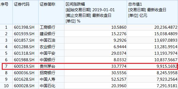 从2018年末开始,贵州茅台开始启动新一轮上涨,而且一路长阳到目前直逼800元大关。据Wind数据统计,2019年以来,贵州茅台涨幅达到33.78%,在A股10家市值7000万以上的大蓝筹排名第2 ,仅次于涨幅超50%的中国人寿。