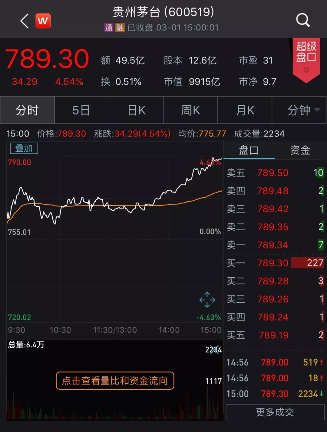 其中,有着“A股风向标”、“A股一哥”、“A股股王”之称的贵州茅台大涨4.54%,目前最新价789.3元,已创下收盘最高价,距历史新高792.26元仅一步之遥;最新市值9915亿元,万亿大关触手可及。