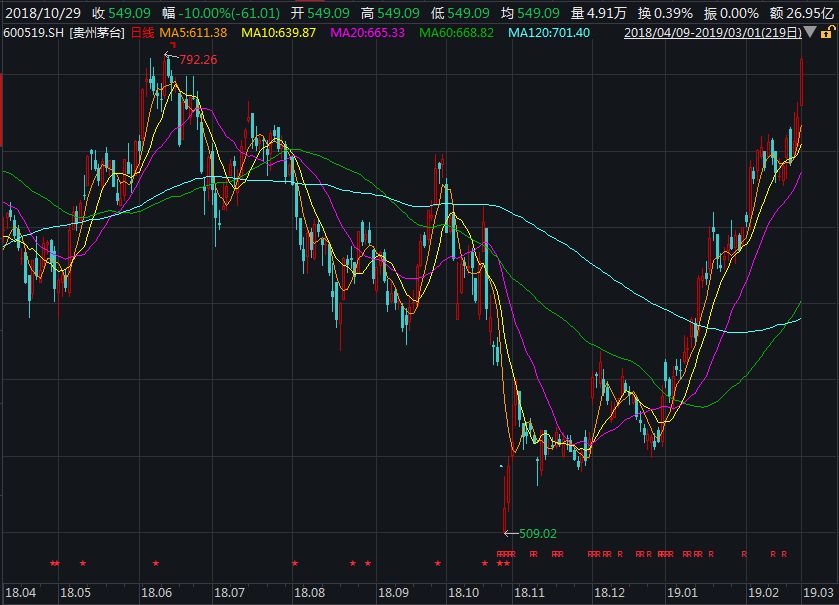 在2018年的熊市中经历了连续4个月的下跌之后,贵州茅台在去年10月29日因业绩低于预期,遭遇史上首个“一字跌停”。次日股价再度走低,盘中一度创下1年多以来的新低价509.02元。
