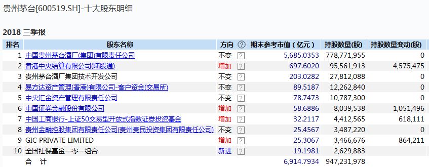 三季报显示,外资(陆股通、GIC PRIVATE LIMITED)、国家队(证金)及上证50指数基金在2018年三季度纷纷加仓贵州茅台,合计增持710万股;全国社保基金101组合在去年三季度新进263万股,跻身贵州茅台第十大股东。