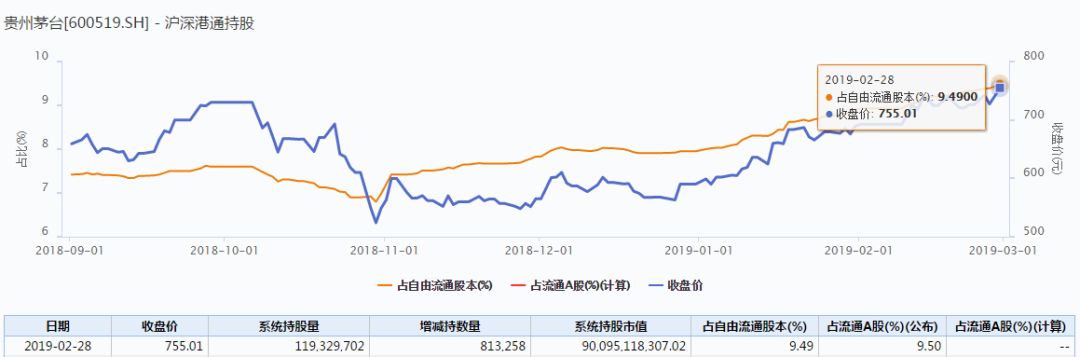 从2018年12月下旬开始,贵州茅台的沪深港通持股数量及占比一路上升。截至2月28日,沪深港通对贵州茅台的持股数量达到1.19亿股,持股市值逾900亿元。