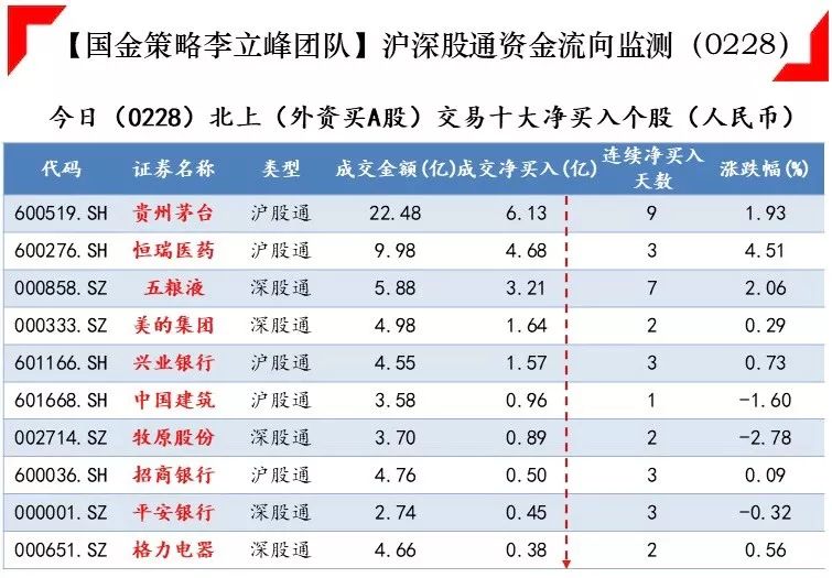 2月28日沪深股通资金流向监测数据显示,贵州茅台获沪股通净买入6.13亿元,是连续第9个交易日净买入。