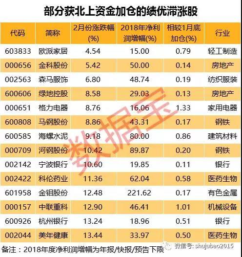 举例来看,欧派家居预计2018年净利润同比增长15%,2月28日相较于1月底获北上资金加仓0.79%,其2月份股价仅上涨4.54%;海螺水泥预计2018年盈利285.39亿元,净利润同比增长80%,北上资金2月份加仓0.86%,2月份股价上涨9.18%。