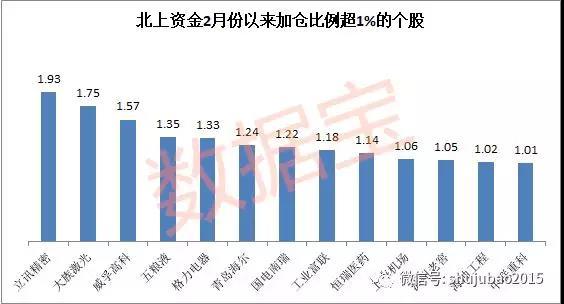 加仓比例居前股中,立讯精密、大族激光、威孚高科、格力电器、青岛海尔及工业富联等13股加仓比例超过1%。值得一提的是,大盘蓝筹股是2月份以来北上资金加仓首选。从持股市值超百亿的18股来看,除海康威视及洋河股份外,其余16股均获大幅增持。与此同时,遭减持股整体减持比例都较低。