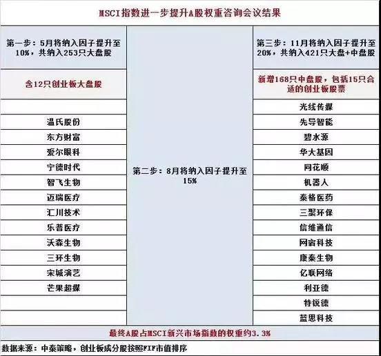 照此计划,预计到2019年11月,MSCI新兴市场指数的成分股中253只中国大盘A股和168只中国中盘A股(其中包括27只创业板股票)。由此, A股占明晟新兴市场指数的权重将从目前的0.71%上升至3.3%。