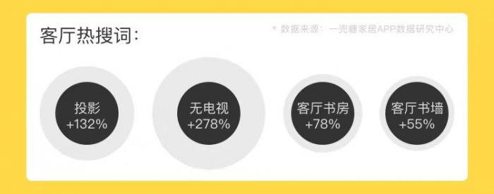 据悉,该《报告》基于一兜糖家居APP平台2000万用户大数据,深度分析20万真实屋主全屋记、超过5万份线上问卷调查,再结合全网家居热搜数据、主流电商家居消费调查制作而成。《报告》显示,在客厅热搜词中,投影增长了132%,客厅书房增长了78%,客厅书墙增长了55%,而无电视则增长了278%。