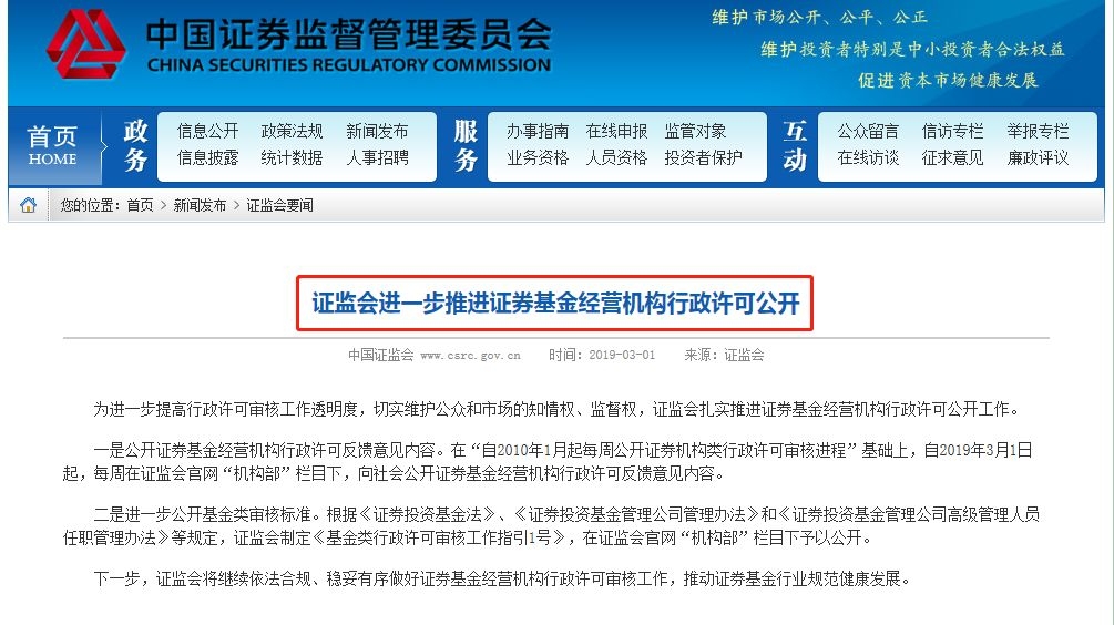 3月1日,证监会新闻发言人常德鹏表示,为进一步提高行政许可审核工作透明度,切实维护公众和市场的知情权、监督权,证监会扎实推进证券基金经营机构行政许可公开工作。
