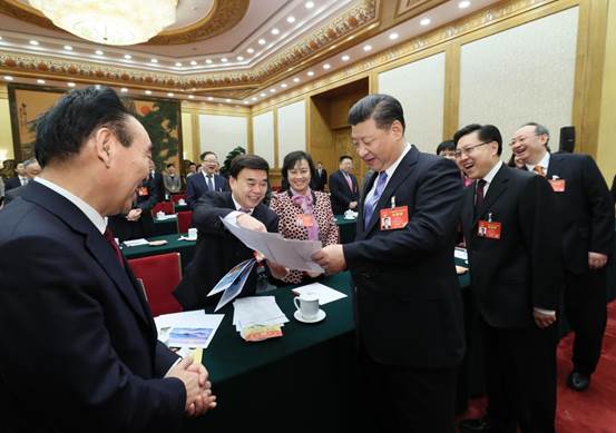2017年3月8日,习近平参加十二届全国人大五次会议四川代表团的审议。这是习近平同代表亲切交流。