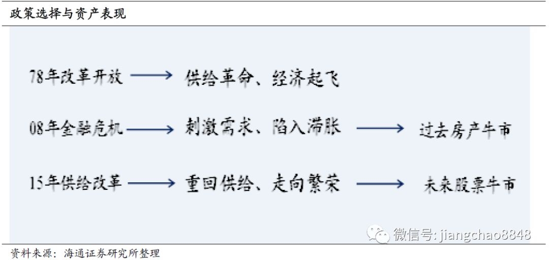 中国在过去10年货币超增、债务率持续上升,经济增速下行而房价持续暴涨,其实就是类滞胀的状态。而在痛定思痛之后,2015年11月,中国正式提出了供给侧结构性改革,这其实类似于美国的“供给学派”改革,意味着我们也把经济增长的重心转回到了供给端。