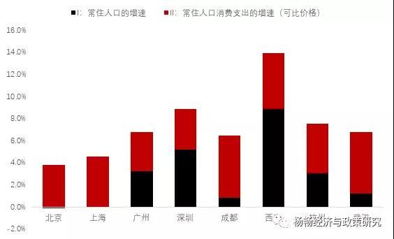 图表3 2017年八个核心城市常住人口数量增速与消费支出增速
