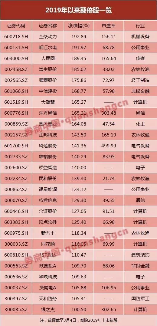 个股成交也十分活跃,据券商中国记者统计,剔除2019年上市新股,股价已翻倍的股票共有26只,其中股价涨幅超过150%的个股共有9只,分别是全柴动力、岷江水电、人民网、益生股份、顺灏股份、中信建投、大智慧、东方通信、国风塑业。