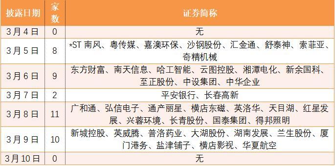 本周共计40家上市公司披露年报。其中3月8日最多,有11家公司选择在这一天披露。其次是3月9日10家和3月6日9家。