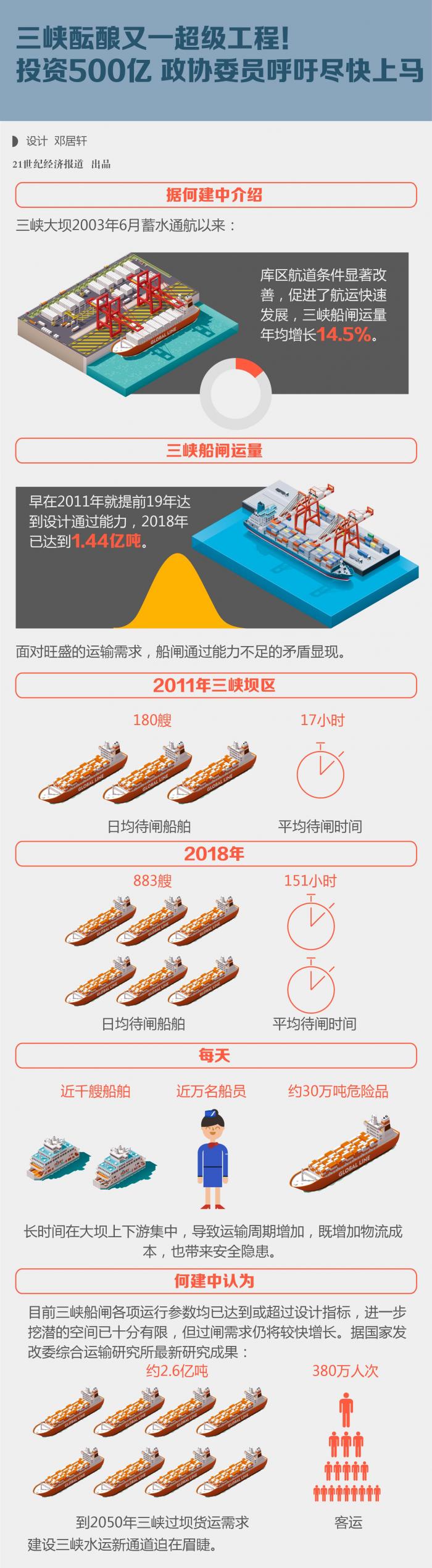 何建中认为,目前三峡船闸各项运行参数均已达到或超过设计指标,进一步挖潜的空间已十分有限,但过闸需求仍将较快增长。据国家发改委综合运输研究所最新研究成果,到2050年三峡过坝货运需求约2.6亿吨、客运380万人次。建设三峡水运新通道迫在眉睫。