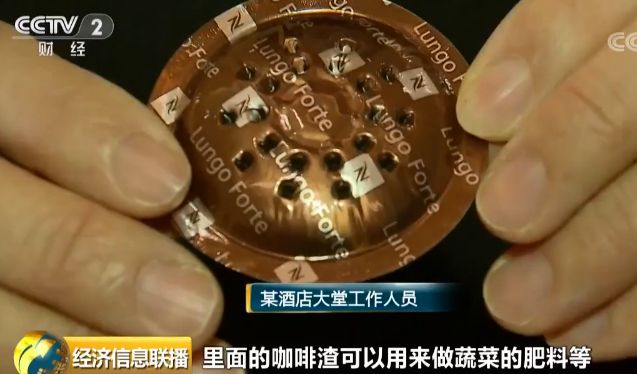 某酒店大堂工作人员:这个外壳是铝制的,它回收之后可以做一些铝制品的产品,里面的咖啡渣可以用来做蔬菜的肥料等。所以,用完之后都会回收。