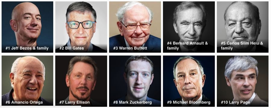 亚马逊创始人贝佐斯及家庭以1310亿美元身价稳居榜首。比尔·盖茨和巴菲特身价位居第二和第三。前十中还包括甲骨文创始人拉里·埃里森 (身价625亿美元排名第7),Facebook 创始人扎克伯格(身价623亿美元排名第8),彭博创始人迈克尔·彭博(身价555亿美元排名第9),以及谷歌联合创始人拉里·佩琦(身价508亿美元排名第10)。