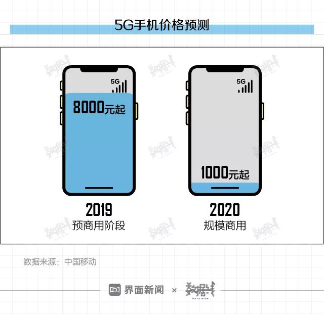 根据中国移动的预测,在2019年预商用阶段,5G手机价格会在8000元以上。到2020年规模商用阶段,5G手机价格可能会降至千元级。