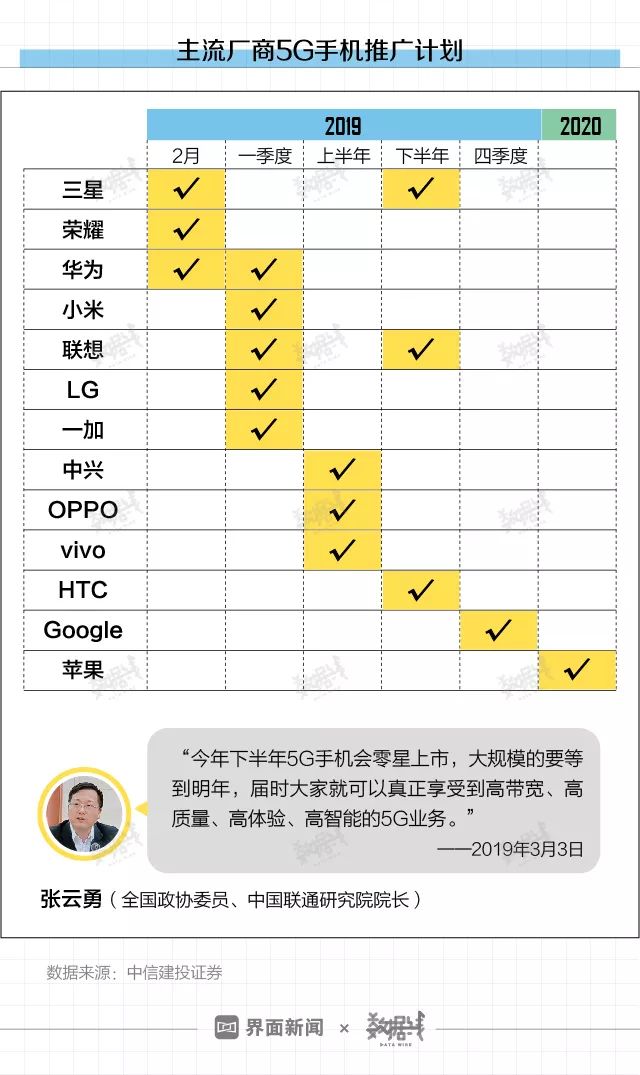据中信建投证券梳理,三星、华为、小米等多家手机厂商都计划在2019年推出5G手机,苹果可能要等到2020年。