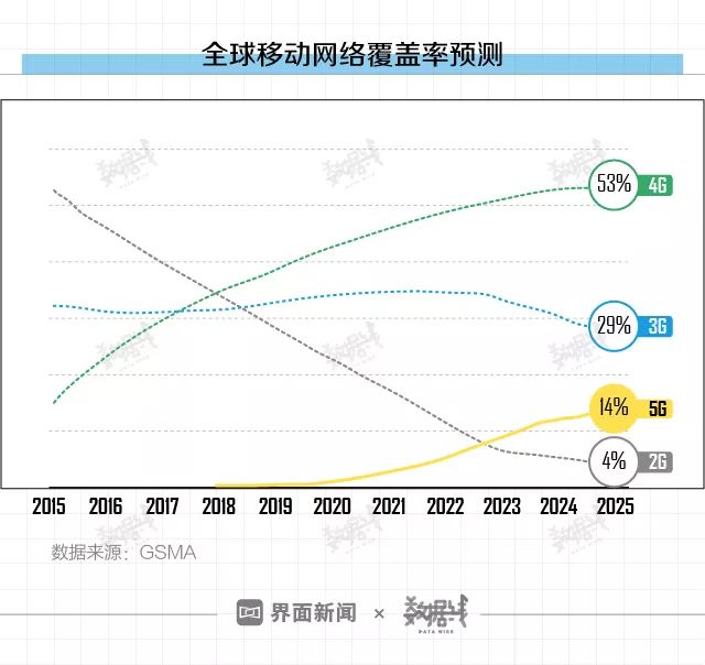 虽然5G现在的发展势头很猛,但在很长的一段时间内,4G仍然会是移动网络市场的“主角”。据GSMA预测,到2025年,5G覆盖率将升至14%,4G覆盖率也将升至53%。