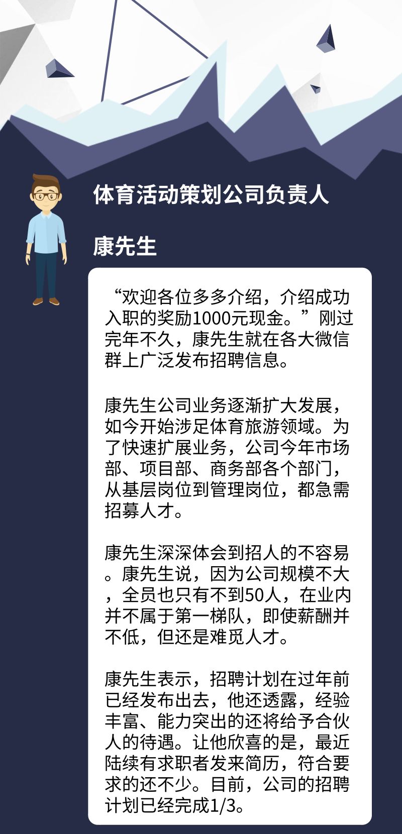 体育活动策划公司负责人康先生: 推荐优秀人才入职,奖励推荐人1000元