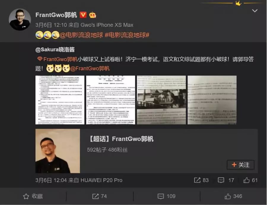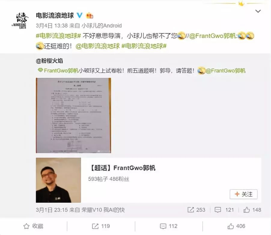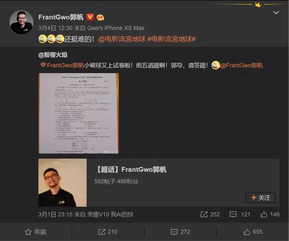 对于被题目难倒了的同学们来说,我出了电影票钱却不知道考题的正确答案,不能忍!!!于是,《流浪地球》的导演郭帆就被大家“艾特”来答题了。
