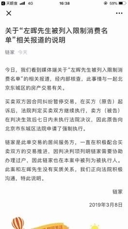 对此,链家表示,“链家是此单交易的居间服务方,一直在积极配合买卖双方的交易推进,因判决判项列明链家需要协助办理过户,因此链家也在本案中被列为被执行人。”同时,链家还回应称,“此案和左晖先生没有实质关系,我们正向法院积极沟通”。