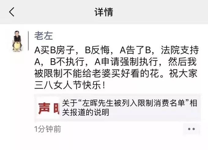 作为被执行人,左晖本人昨天则在微信朋友圈调侃,“被限制不能给老婆买好看的花”。同时,他也将这件事描述成“A买B房子,B反悔,A告了B,法院支持A,B不执行,A申请强制执行”。
