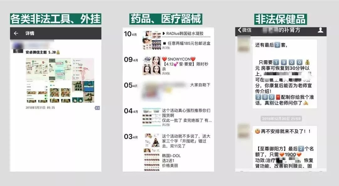 共计对2800多个发布“违法违禁品”售卖信息的微信帐号进行阶梯式处罚;对1200多个发布“违法违禁品”售卖信息的微信群进行阶梯式处理;对900多个发布“违法违禁品”售卖信息的链接进行封禁处理。