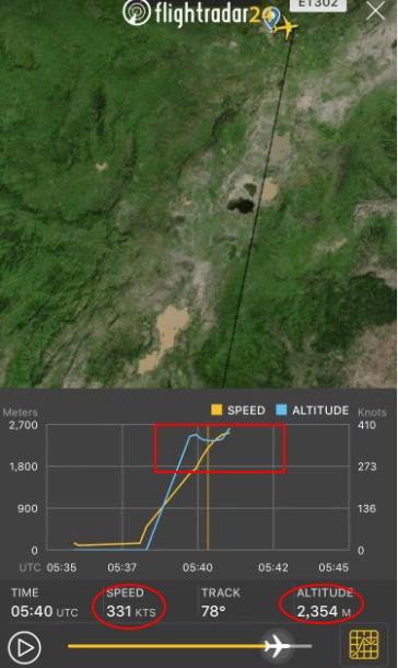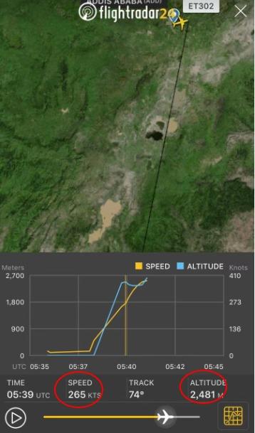 在8点40分左右,该飞机的飞行高度出现下降的同时,其飞行的速度却出现了大幅度的上升,从2481米时候的265节(海里/小时),上升到2354米时候的346节,此后随着该飞机飞行高度的修正,飞行速度亦持续提高,至有飞行数据记录的最后一刻,飞机高度达到2621米,但其速度已经达到了383节。