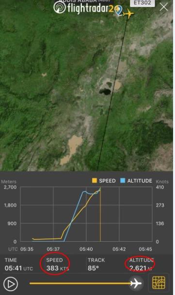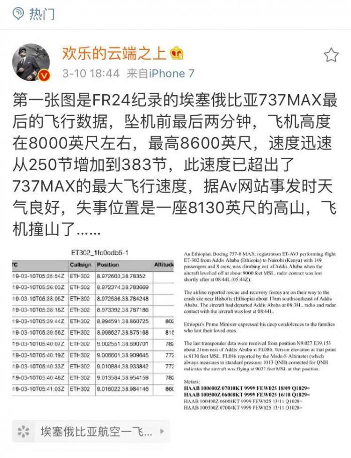 而提供该数据服务的Flightradar24也在新浪微博发布消息称:该飞机起飞后的垂直速度(VS)并不稳定。新浪微博认证信息为“民航飞行员”的用户“欢乐的云端之上”称,383节的速度已经超过了737MAX的最大飞行速度。