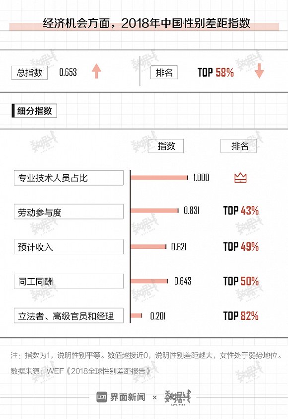 从经济机会的细分指数来看,目前中国女性在劳动参与度、预计收入、同工同酬、高管任职等4个方面面临不平等。