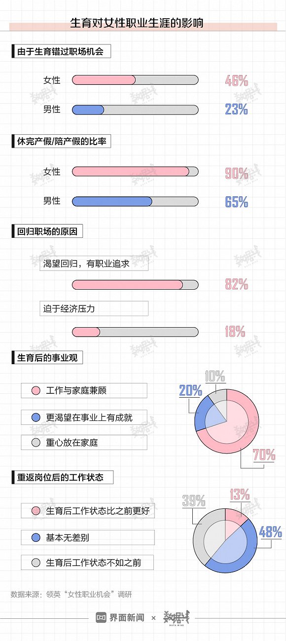 领英数据显示,在生育前后近1/3的女性更换了工作或没有回归职场成为自由职业者;46%的女性由于生育主动或被动地错过了职业机会,该比例是男性的两倍。