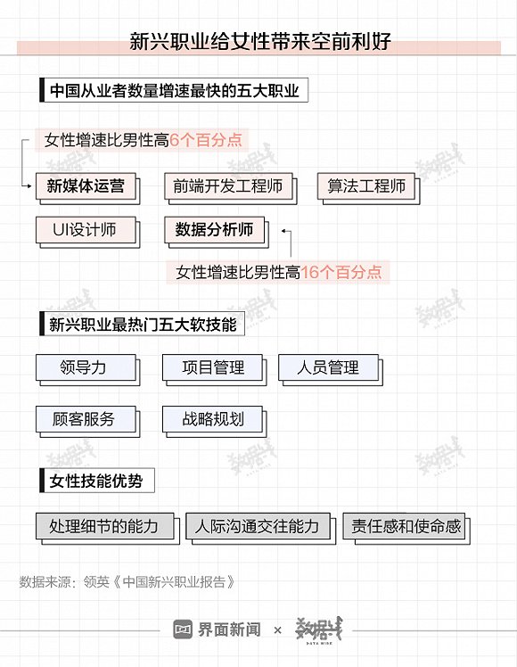 另一方面,随着新媒体运营、数据分析师等新兴职业的兴起,女性善于沟通、责任感强等软技能的重要性越来越突出,女性职业机会在不断增多。